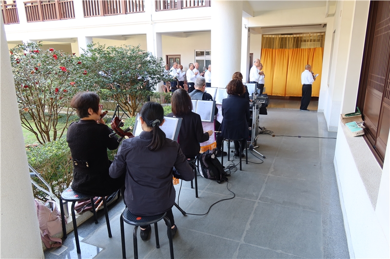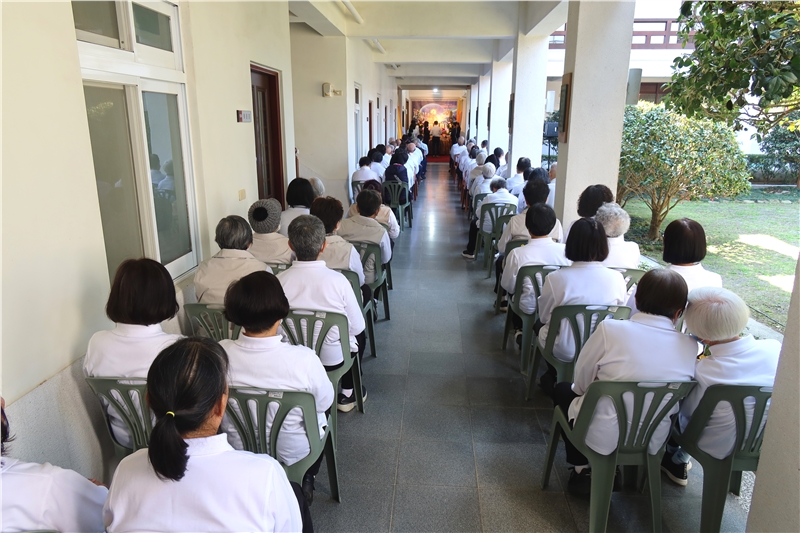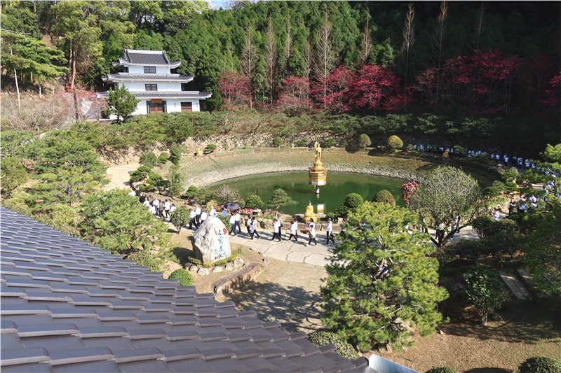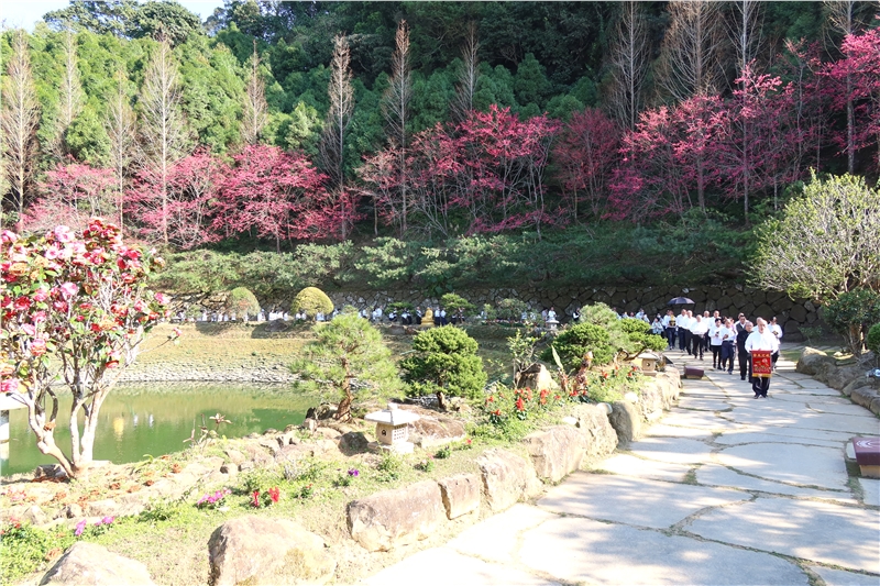 2月14日下午二時,由苑長親臨主持,在渠念茲在茲心所嚮往的蓮臺山舉行蓮池海會告別式,有來自全省各地同倫約150人參加;牌位在戒定真香、苑長、維那前導下,跟著大眾右繞蓮池三匝巡禮。直徑五十公尺正圓的七寶蓮池,象徵圓滿;更是苑長會下諦聽佛法入理,轉識成智而為大圓鏡智,入本心回歸無為法界的表法呈現。是日風和日麗,彌陀願海七寶蓮池周圍各類花卉植栽以及龍邊櫻花綻放,似乎在為哲人生前的行持稱頌。