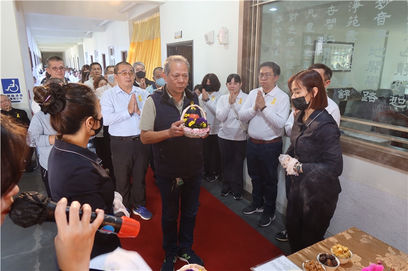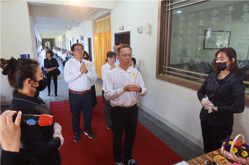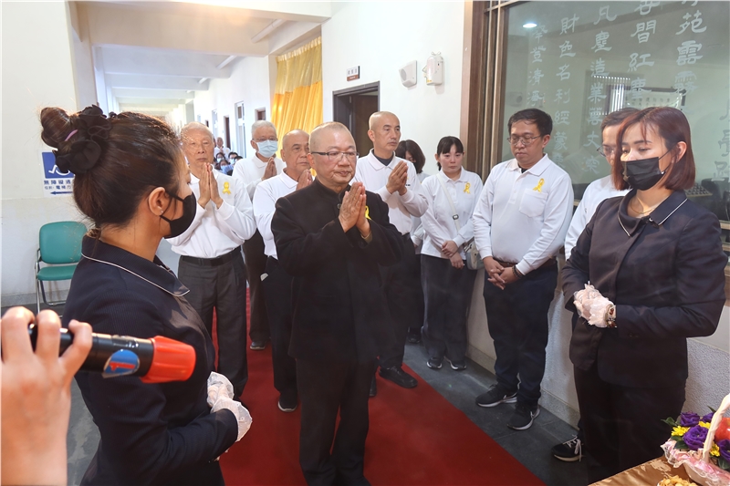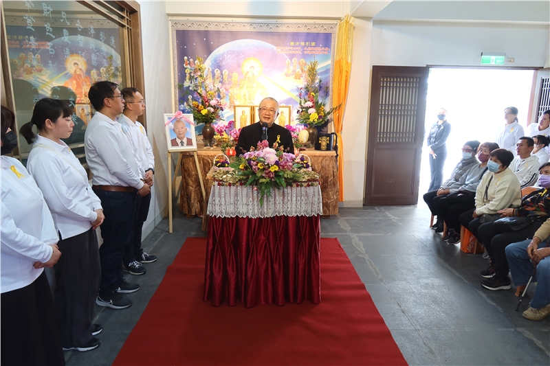 張明宗代理班長代表台中分苑致詞略以:十幾年來,廖班長總是默默地為台中班與蓮臺山心力付出,用行動、用真心帶領著我們,令人欽敬有加。這次臨終考試,成績斐然,實在精采,苑長開示、學長助念、阿彌陀佛加持,加上您求生西方的切願,是多麼的堅定強而有力,正念分明,清清楚楚與會眾十念佛號,真正符合阿彌陀佛四十八大願的第十八願旨意,將之發輝到淋漓盡致,太漂亮了。您已經招來我們蓮臺山所有往生菩薩們歡喜降臨參加您的告別儀式。包括您我在內,所有蓮臺山的同倫非常有福報,能在廖苑長會下修學佛法,短短十幾年,您已經完成「諸漏已盡。梵行已立。所作已辦。不受後有。」直接驗證開經偈「百千萬劫難遭遇,我今見聞得受持」的義諦。雖心百般不忍不捨,惟生死這一條路是我們每一個人都要走的。故我等也就早將悲傷化為更精進的力量。最後謹代表台中分苑全體學員再次向您說聲「班長!謝謝您」。
