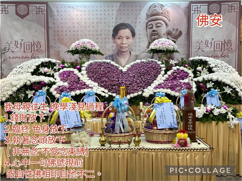 「謹衷心禮謝蓮臺山大家長廖苑長宣揚佛陀正法,引導慈母永出輪迴,回歸自性故鄉之不可思議。同時,代表家屬禮謝蓮臺山團隊每一位學長,助缘蓮池海會,得生淨土,圓證菩提。」
