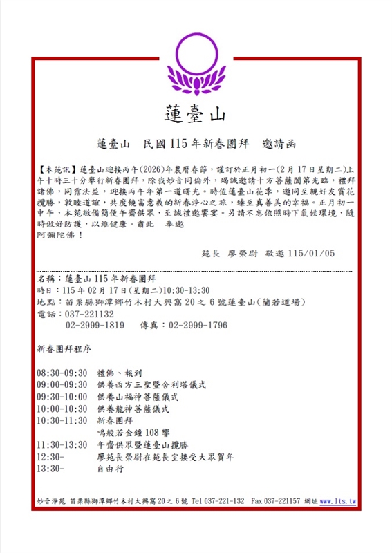 【本苑訊】蓮臺山迎接丙午(2026)年農曆春節,謹訂於正月初一(2月17日星期二)上午十時三十分舉行新春團拜,除我妙音同倫外,竭誠邀請十方菩薩闔第光臨,禮拜諸佛,同霑法益,迎接丙午年第一道曙光。時值蓮臺山花季,邀同至親好友賞花攬勝,敦睦道誼,共度饒富意義的新春淨心之旅,臻至真善美的幸福。正月初一中午,本苑敬備簡便午齋供眾,至誠禮邀饗宴。另請不忘依照時下氣候環境,隨時做好防護,以維健康。肅此 奉邀